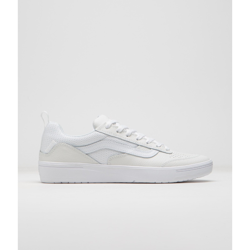 Vans Zahba Shoes in White. Part of Vans VR3 project with a biobased VR3Cush foam midsole and a recycled inner heel counter, this Vans Zahba is designed with mixed leather and athletic-mesh uppers. Featuring reinforced DURACAP underlays, a perforated forefoot, a recycled foam sockliner and an ImpactWaffle outsole, this white Vans Zahba also features an ImpactWaffle tread. Finished with a rubber tongue badge, printed insoles and with woven heel pulls.