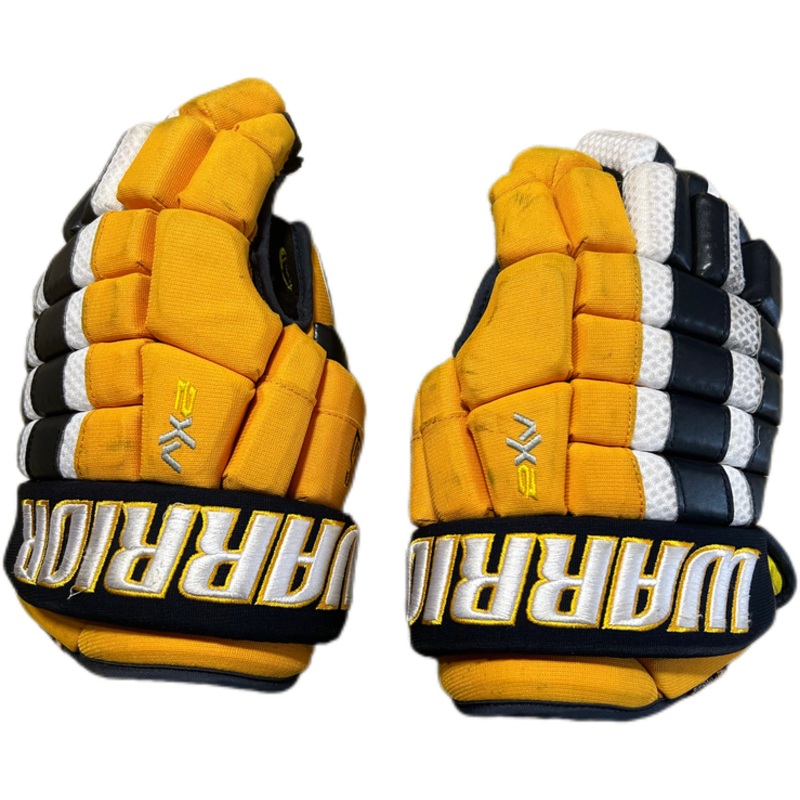 Warrior Dynasty AX2 – Used Pro Stock Hockey Gloves (Yellow/Navy/White)