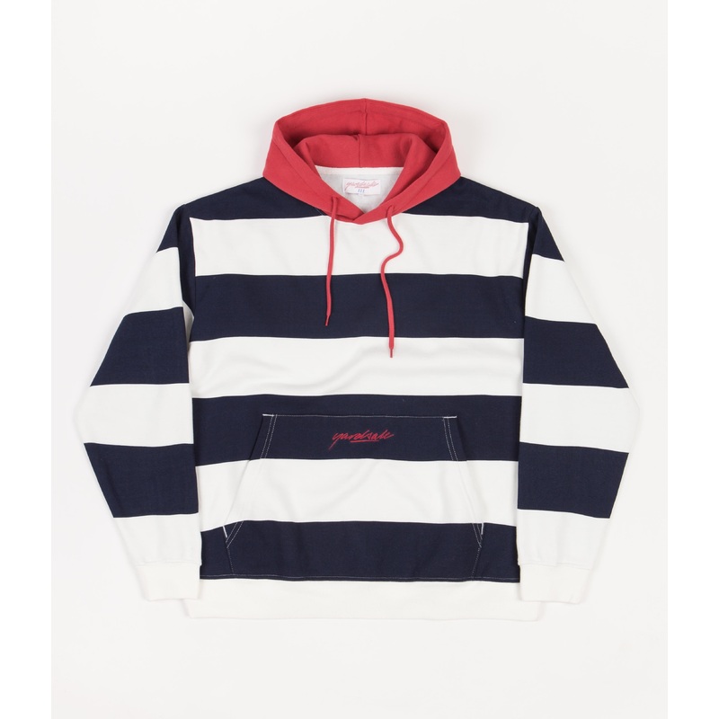 DescriptionYardsale Airway HoodieYardsale Airway Hoodie in Navy, White and Red. A stand-out new addition to London based Yardsales apparel offering, this Yardsale Hoodie is made from a soft cotton polyester blend and features a distinctive two tone striped