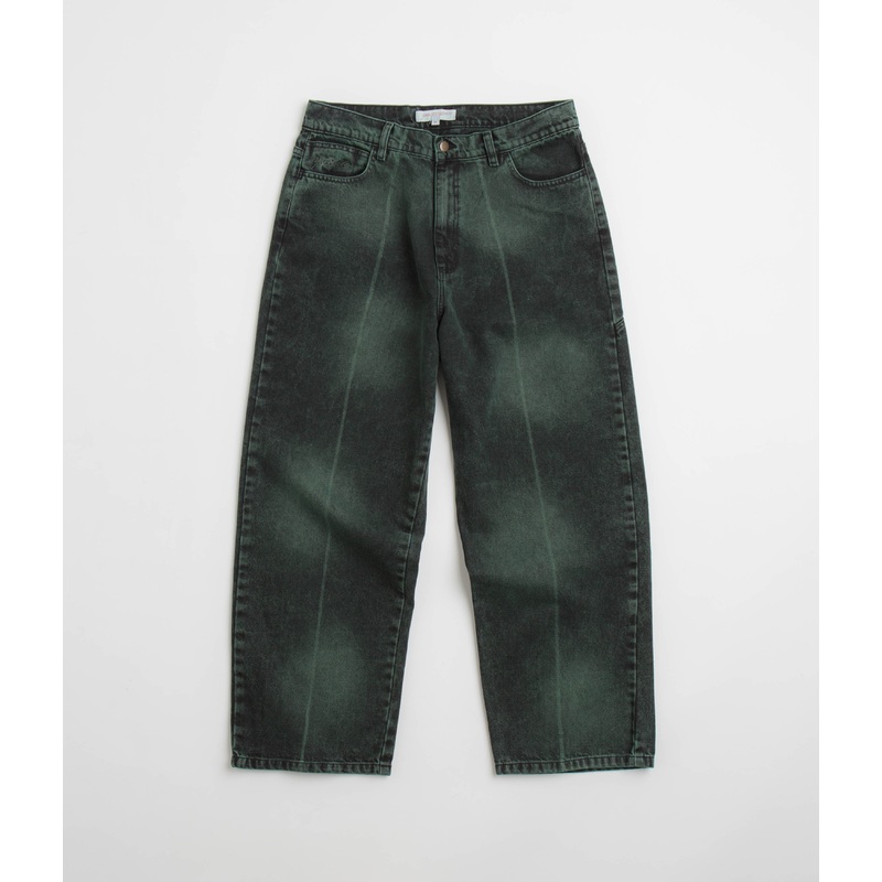 DescriptionYardsale Bleached Phantasy JeansYardsale Bleached Phantasy Jeans in Emerald. Loose fitting and made from cotton denim, these overdyed Yardsale jeans are styled with a tie-dyed design. Featuring a belt loop waist, a single button secured zipper f