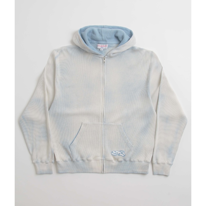 Yardsale Bleached Waffle Hoodie in Blue. Made from a cotton-polyester blend with a bleached Bioball-washed construction, this Yardsale hoodie is styled with a drawstring hood and a full length zipper fastening. Featuring ribbed cuffs, this blue Yardsale hoodie is finished with two front pockets and screen printed branding.