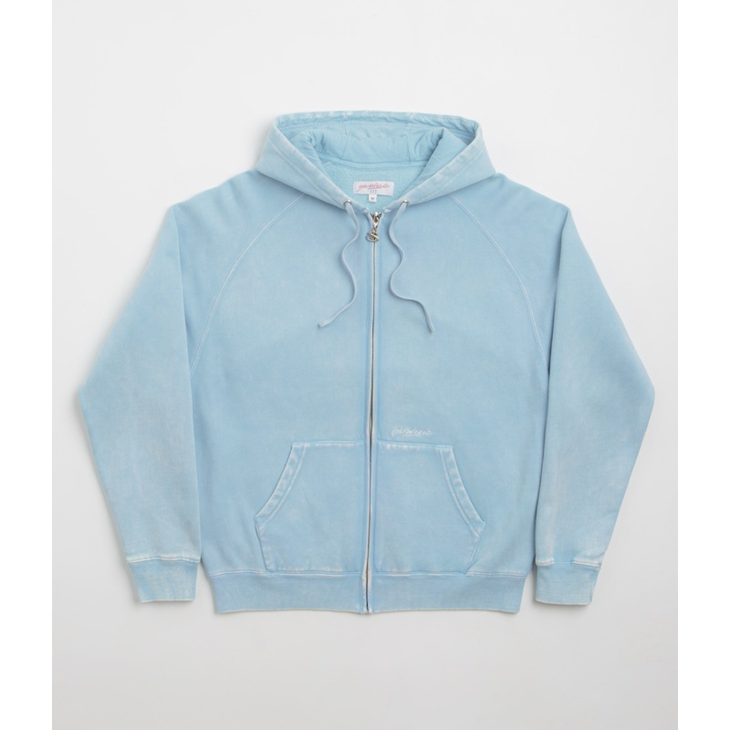 Yardsale Sundown Hoodie in Baby Blue. Regular fitting with a Bioball-washed construction, this Yardsale hoodie is made from a cotton-polyester blend. Featuring an adjustable drawstring hood, raglan sleeves, ribbed cuffs and a full length zipper fastening, this light blue Yardsale hoodie is finished with two front pockets and with a custom YS zip pull.