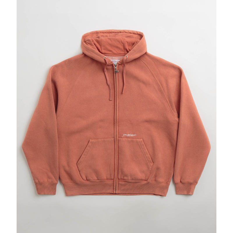 Yardsale Sundown Hoodie in Orange. Part of the brands latest release, this regular fitting Yardsale hoodie is made from a washed cotton-polyester blend. Featuring a drawstring hood, a full length zipper fastening, raglan sleeves and ribbed cuffs, this orange Yardsale hoodie is finished with two waist pockets, embroidered branding and a custom YS zipper.