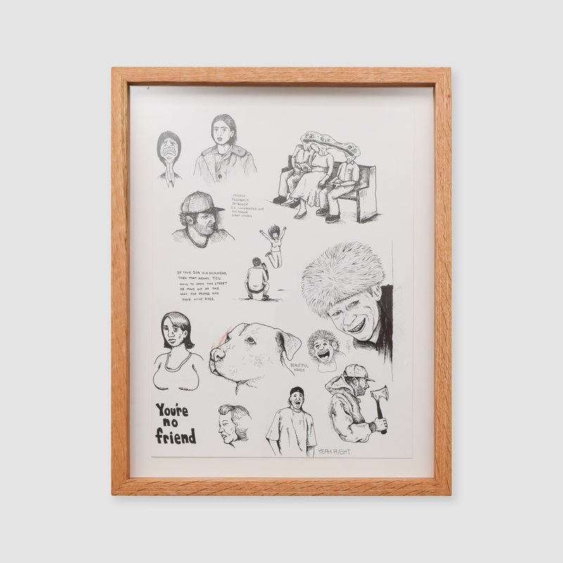 Mike Lottie Gigliottis artworks. Frames by Josh Pall.While Lotties practice has touched on painting, pottery, and watercolour, this exhibition returns to his roots, black ink pen on paper."Growing up, I was lucky to have parents who at one time owned a chi