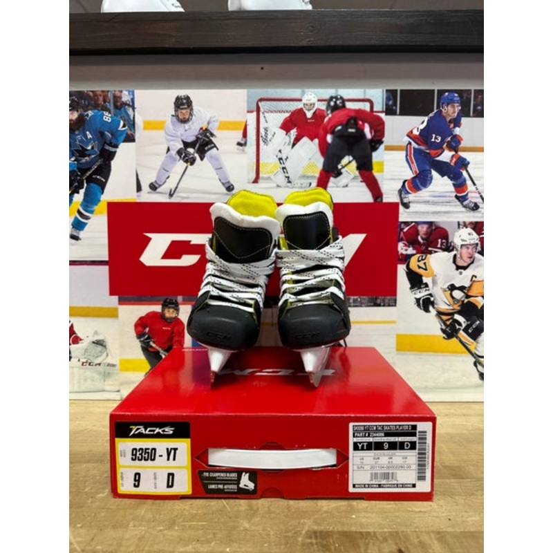 SpecificationsCategoryHockey > SkatesBrandCCMModelTacks 9350Skate Size Youth - 9Condition NewAge Group YouthQuantityMore than 1 available|||Seller DescriptionYour young hockey players will love the comfortable boot-shaping system and brushed microfiber
