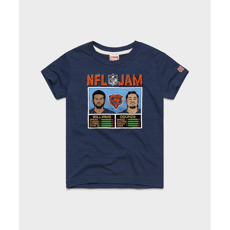 Boomshakalaka! Youth NFL Jam is here! Rep your favorite Chicago Bears duo with a tri-blend youth tee for Caleb Williams and Rome Odunze, and lets get ready for some football. Theyre on fire!