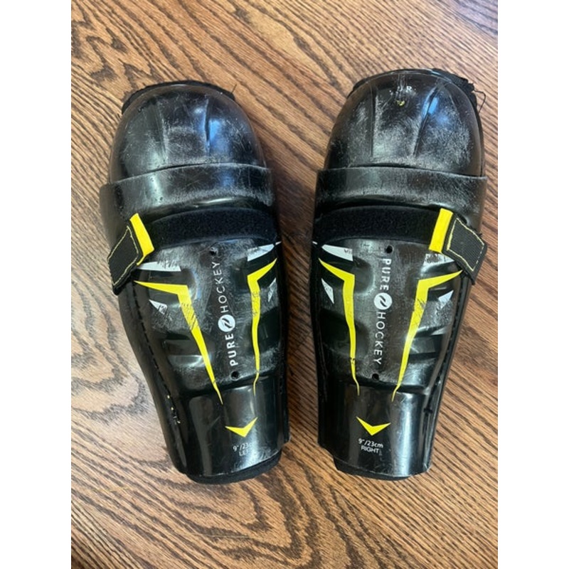 SpecificationsCategoryHockey > Protective > Shin PadsBrandPure HockeyAge Group YouthSize 9"Condition UsedQuantity1 available|||Seller Description9 hockey shin guards. Pure hockey brand. Used half a season. Velcro is not very sticky, scuffs as se